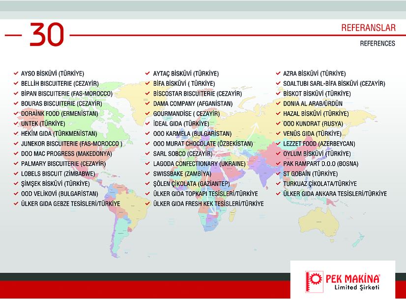 KARDEŞ FİRMALARIMIZ PEK MAKİNA LTD VE BEMAK LTD. ŞİRKETLERİNİN ANAHTAR TESLİMİ YURT DIŞI VE YURT İÇİNDE KURDUĞU BİSKÜVİ, KRAKER VE KEK TESİSLERİNDE İMALATINI TİTİZ BİR İŞÇİLİK VE YÜKSEK KALİTE MALZEMEDEN İMAL ETTİĞİMİZ ÖRGÜ BANTLAR BAŞARIYLA ÇALIŞMAKTADIR.